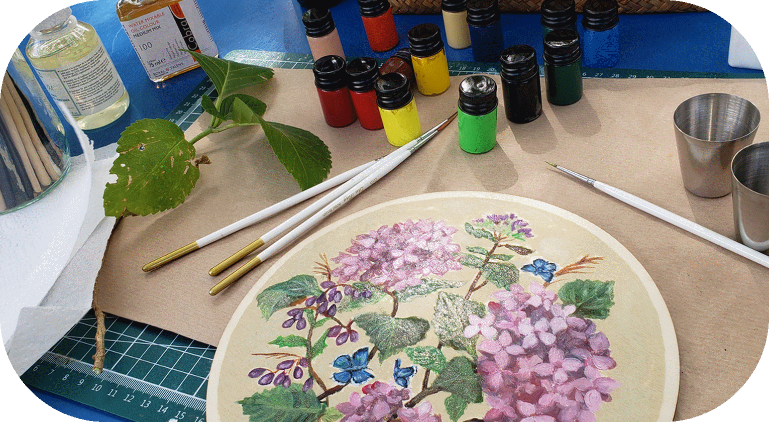 Je la travaille sur le bois ou la toile, en technique mixte, c'est à dire après une première couche d'acrylique. Cela permet de réduire le temps d'attente entre l'exécution d'une ébauche et son perfectionnement.