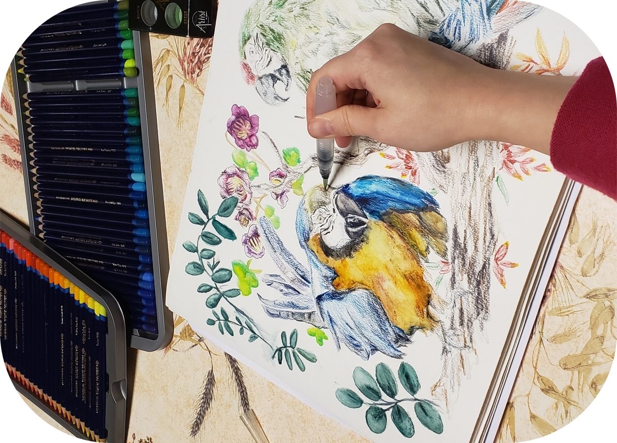 Le crayon de couleur aquarellable est pour le moment la technique que j'utilise le plus en aquarelle. Très à l'aise avec lui, je le trouve vraiment magique, et son tracé soluble à l'eau m'a conquise tout de suite.